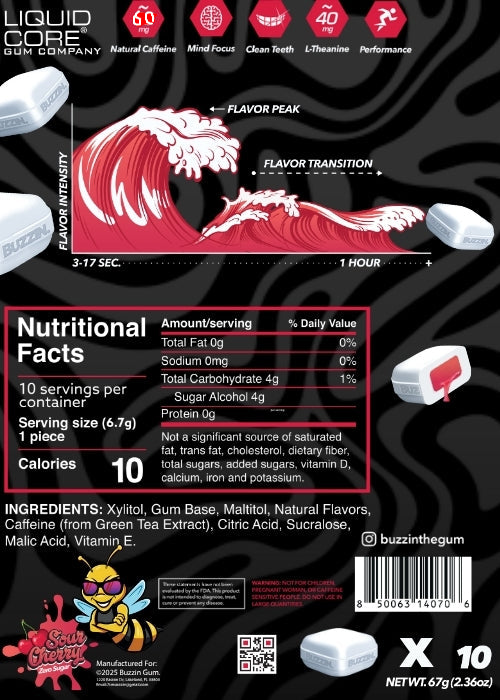 Buzzin Sour Cherry Gum delivers smooth, focused energy with 60mg caffeine and 40mg L-Theanine, the natural amino acid from tea that promotes calm focus and reduces the jitters of caffeine. Perfect for students, professionals, and anyone seeking a smarter, cleaner energy alternative to coffee or energy drinks.